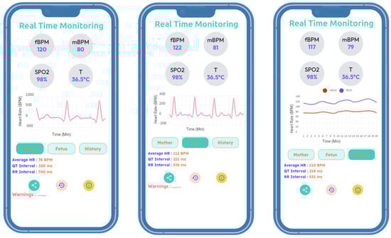 In order to make our data more accessible and easy to manipulate and to enable real-time monitoring, we have created a mobile application that runs on both the iOS and Android platforms. This application was created using Flutter’s Dart language and consists of two main pages. The first page is dedicated to user authentication, requiring a login and password. The second page displays real-time data on three tabs. These tabs are equipped with buttons for sharing data or contacting a doctor. The first tab displays ECG information for pregnant women. The second tab is dedicated to displaying fetal ECG information. Finally, the third tab, entitled ‘History’, displays the history of heartbeats (‘BPM’) over time. Figure 10 shows the real-time monitoring of results on the mobile interface, which offers the user three options: