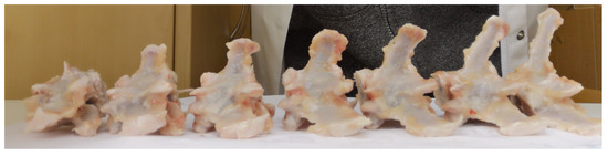The animals underwent an autopsy, wherein the lumbar vertebrae from L1 to L7 were extracted, as shown in Figure 1. The dissected segment was then stored at a temperature of in a freezer. For biomechanical analysis, this segment was slowly returned to room temperature (). After thawing, the segment underwent processing, during which the surrounding muscular and adipose connective tissues were carefully removed. Each vertebra was individually isolated, and the spinal cord was excised.