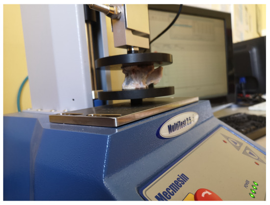 For the second group of tests, lumbar vertebrae were examined using a Mecmesin MultiTest 2.5-i micro-compression machine (Mecmesin Limited, Slinfold, UK) (Figure 2). The Mecmesin AFG25 cell, which controls deformation, achieved a measurement precision of within mm. It applied compressive forces ranging from 2 N to 2500 N with a precision of and maintained a crosshead speed with the same level of accuracy. During this process, each vertebra underwent compression at a force of 950 N and at a rate of 1 mm per minute. The compression process was repeated ten times for each vertebra. Post-experimentation, the axes of each vertebra were measured, and cyclic loading was applied when the specimen was in place.