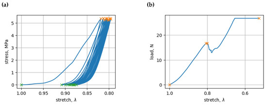 (a) Minima (green x) and maxima (orange x) of experimental stress values of a cyclic load; (b) minima and maxima of experimental stress values of ultimate load.