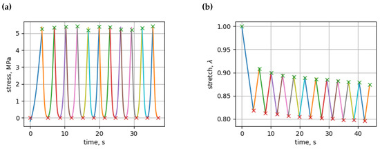 (a) Stress approximations by logistic function for each cycle; (b) stretch approximations by second-order polynomials for each cycle.
