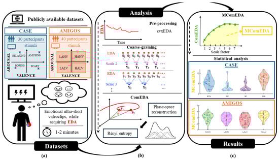 The performances of MComEDA and ComEDA algorithms were tested on two different publicly available datasets, i.e., CASE and AMIGOS [,], containing EDA signals acquired during short and ultra-short video-based stimuli presented to healthy participants. A summary of the steps is graphically represented in Figure 1.
