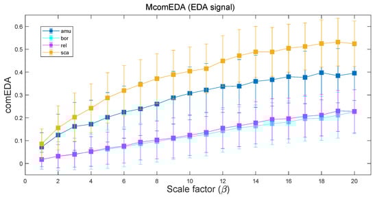 In the case of the second dataset (AMIGOS), sixteen videos were presented to forty healthy subjects and categorized according to their membership of the four quadrants of the arousal–valence plane (HALV, HAHV, LALV, and LAHV). Using , we found statistical differences between the stimuli in the HALV quadrant (p-value < 0.05) and the two low-arousal quadrants. In addition, the values were statistically different when we observed the trends in the multiscale complexity of EDA signals recorded during HAHV and LALV stimuli (p-value < 0.05).
