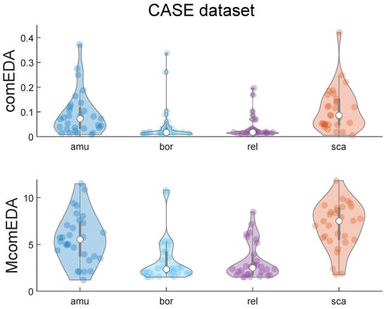 We tested the capabilities of the MComEDA algorithm to discern the physiological responses to different categories of emotional video stimuli using two publicly available datasets, i.e., the CASE [] and the AMIGOS [] datasets. Then, we compared the performance of MComEDA with the results obtained applying the single-scale version of the algorithm, i.e., ComEDA []. In more detail, we investigated how the ComEDA and MComEDA metrics perform when setting as input the noiseless EDA signals (i.e., the sum of the tonic and phasic components after the application of the cvxEDA approach as a pre-processing step).