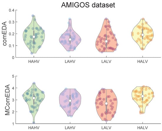 Concerning the AMIGOS dataset, each subject was monitored during the elicitation through four emotional videos for each quadrant of the valence–arousal plane: High Arousal and Low Valence (HALV), High Arousal and High Valence (HAHV), Low Arousal and Low Valence (LALV), and Low Arousal and High Valence (LAHV). We computed the corresponding values of ComEDA and MComEDA and we calculated their average considering each quadrant separately. In this way, we obtained four different values for each metric and each subject, corresponding to the four different quadrants of the valence–arousal plane.