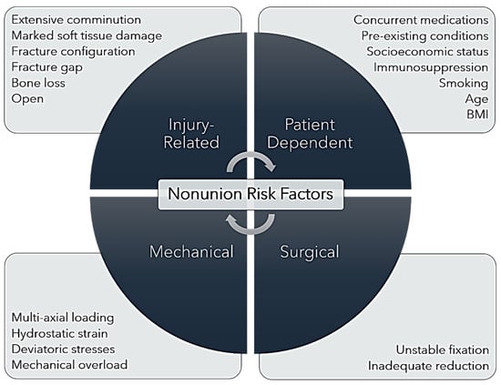 - Dailey, H.L.; Wu, K.A.; Wu, P.S.; McQueen, M.M. Tibial Fracture Nonunion and Time to Healing after Reamed Intramedullary Nailing: Risk Factors Based on a Single-Center Review of 1003 Patients. J. Orthop. Trauma 2018, 32, e263–e269. [Google Scholar] [CrossRef] [PubMed]