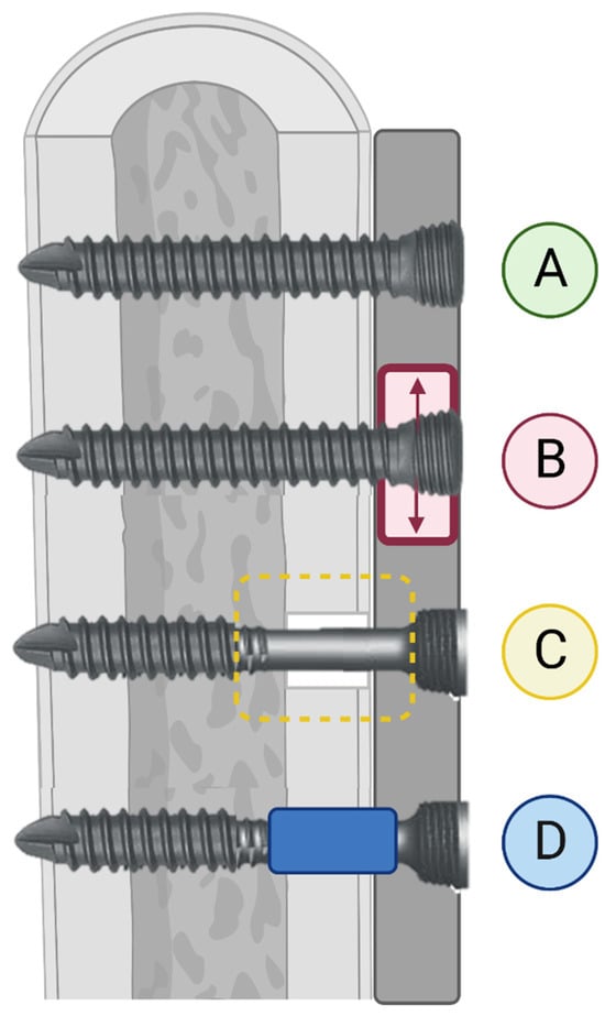 - Schultz, B.J.; Amin, N.H.; Mattison, B.J.; Mir, H.R.; Shah, A.R.; Cerynik, D.L. Locking Screws with a Threaded Degradable Polymer Collar Reduce Construct Stiffness Over Time. J. Orthop. Trauma 2020, 34, 151–157. [Google Scholar] [CrossRef] [PubMed]