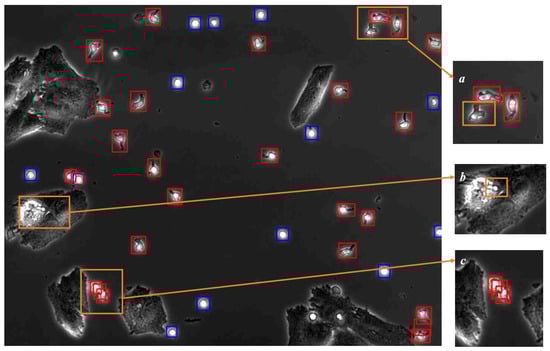 Example of our detection algorithm results, where the blue boxes mark NP-NKCs, and the red boxes are for P-NKCs. It shows that, although the overall detection accuracy is as high as 92%, there still exist the following types of errors: (a) Due to insufficient training samples, the algorithm’s generalization ability is limited, resulting in a small number of NKCs not being successfully detected; (b) The complexity of the background makes it difficult to detect NKCs near cancer cells using only the current frame; (c) Targets are redundantly boxed, a frequent occurrence in densely populated cell areas.