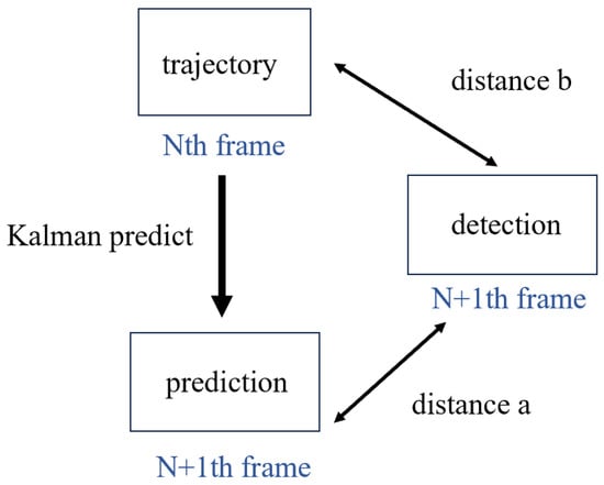 Two kinds of distance. In this figure, trajectory refers to the historical movement information of targets. Prediction refers to the inferred position of the target in frame N + 1, which is derived through Kalman filtering using the trajectory data—specifically, the known position and velocity from frame N. Detection refers to the actual position of targets in frame N + 1, as determined by the detection algorithm. At this point, we need to match the detection in frame N + 1 with the trajectory in frame N. Here, we propose distance “a”, which is the difference between the actual position and the predicted position, and distance “b”, which is the displacement of the actual position compared to the previous frame.