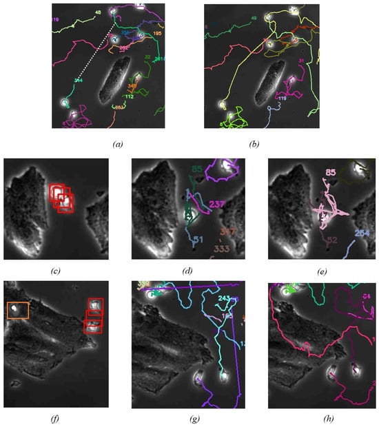 After employing motion information for matching, we opted for a cascaded matching algorithm in our tracking process. The purpose of this approach is to temporarily retain trajectories that have lost tracking, enabling them to be further tracked when the target reappears in the field of view. This method records the time t when a trajectory loses tracking and matches trajectories with the same loss time t to detection boxes on the same level. Trajectories with shorter loss times t are given higher priority for matching, while trajectories with are abandoned. We considered that, with increasing t, the predictive reliability of trajectories gradually decreases. Hence, in the distance weighting, we linearly decrease the weight of distance a from 0.8 to 0. Additionally, as t increases, the distance threshold for cell movement should also increase. Under the conditions of two-dimensional Brownian motion, the displacement of cells within a time interval follows a normal distribution with . Setting the distance threshold to the reference distance of Brownian motion is one of the main improvements of our algorithm. We calculate the diffusion coefficient for the current time based on the statistics of all cells in the previous three frames and set the distance threshold to . As show in Figure 6b, we can see that, after employing Distance Cascade Matching, we are able to effectively track fast-moving targets.