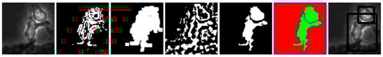This image shows how we search for prominent objects near the target. From left to right, the images represent the original cell image, the cell boundary obtained through Sobel segmentation, the image mask formed after dilation, the boundary obtained through the adaptive method, the overlap between the mask and the boundary, the segmented image using the watershed algorithm, and the final drawn bounding box.