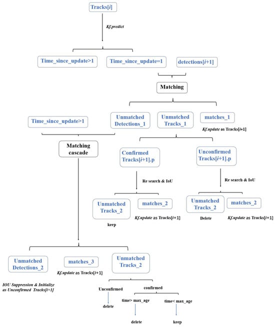This figure illustrates how we perform the tracking process. “Tracks[i]” in the figure refers to the collection of target trajectory information up to the ith frame, including the position, velocity, and “time_since_update” information for each target. As the number of frames increases, we need to continuously update the motion status of each target. The “time_since_update” value reflects how long it has been since a target’s motion status was last updated, which can be understood as the time a target trajectory has been lost. “Detections[i + 1]” refers to the collection of targets detected in the (i + 1)th frame. Our algorithm process involves matching “Detections[i + 1]” with the historical trajectories “Tracks[i]” to update the targets’ status data. “Confirmed tracks” in the figure refer to the trajectories successfully tracked for more than three consecutive frames. Even if there are brief unsuccessful matches along the way, we retain the status of these trajectories. For “unconfirmed tracks”, if they lose their matches midway, we directly delete their trajectory information.