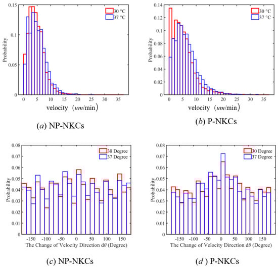 Further investigation into the directional consistency of these cells’ movement revealed intriguing patterns in the velocity deviation angles, depicted in Figure 10b. It is observable that P-NKCs have a higher probability of maintaining their original direction of motion, whereas the velocity deviation distribution of NP-NKCs is more uniform. This result seems to indicate that the movement of NP-NKCs is nearly random, while the movement of P-NKCs is non-random. However, further analysis of the data suggests otherwise.