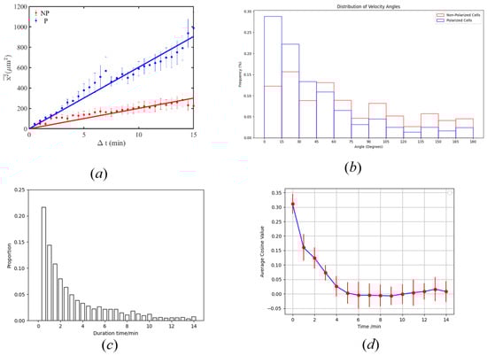Lastly, by assessing the average cosine of the velocity deviation angle over time, illustrated in Figure 10d, we observed a notable decay in directional consistency over time. Combining these observations, we believe that polarized cells tend to move along the polarization direction, and, in the absence of external stimuli, the polarized state of natural killer cells is maintained for a certain period. This maintenance of polarization explains why P-NKCs exhibit a consistent direction of velocity over time. However, over longer periods, the direction of velocity of polarized cells remains random and disorderly, which is also evident from the MSD–time regression curves.