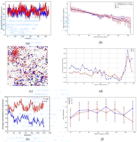 (a) The relationship between the average distance of NKCs and time, where blue corresponds to P-NKCs and red corresponds to NP-NKCs. The same color scheme applies to the other figures. (b) The relationship between the average number distribution of NKCs per frame and distance, with the standard deviation calculated across different frames. The y-axis is logarithmically scaled and regressed. (c) The total number distribution of NKCs in the cancer cell environment, where the dashed black lines in the figure represent equidistant lines to the surface of the cancer cells. Note that this figure does not represent the average number distribution of cells in a single frame but is formed by overlaying the cell numbers from all time points. (d) The relationship between the average density distribution of NKCs per frame and distance. (e) This figure shows the change in average distance over time for two types of cells. It can be observed that P-NKCs reduce their distance to cancer cells more quickly as time progresses. (f) The relationship between the velocity deviation angle of NKCs and their distance to cancer cells.