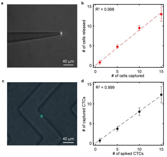Our SCT system was used to create a calibration curve to illustrate both its accuracy and its precision in CTC spiking at low concentrations. To further demonstrate its spiking abilities, we transferred CCRF-CEM cells to whole blood samples for CTC capture and enumeration using a microfluidic chip. Since the essential components of the SCT only include a tapered capillary, a syringe, and a micromanipulator, the system can be assembled in an economical manner. Although tumor cells were the focus of this report, our apparatus is expected to be applicable to other applications to replace traditional serial dilution procedures as well as commercial SCT methods. The current SCT platform focuses on single-cell transfer, which mainly targets floating cells. Therefore, it can easily target cell suspensions such as white blood cells. For epithelial cells and endothelial cells, they can be targeted and transferred if they are in a suspension state. However, if they are in an adhesion state, it is hard to aspirate them using the SCT without destroying them. For future studies, this system can be combined with adherent-cell-release technologies such as optical tweezers [] to manipulate adherent cells.