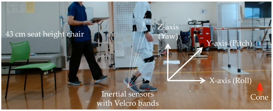 After explaining the method of each test to the subjects, we commenced the 10 MWT. A straight line of 16 m, including acceleration and deceleration paths of 3 m each, was used, and the time required to cover the central 10 m was measured using a stopwatch. Subsequently, the TUG was performed. The TUG used a chair with a seat height of 43 cm and one cone. Using a stopwatch, we measured the time required to stand up from the chair, walk 3 m, turn at the cone, return, and sit down again. Figure 1 shows an actual TUG measurement scene with an attached inertial sensor. Both tests were conducted twice at normal speed, and the patients were instructed to walk with or without a cane. The decision regarding the mode of walking was made in consultation with the physiotherapists in charge and the patients themselves. Other physical functions assessed included grip strength and the Frailty Screening Index (FSI) [19]. Patients were also asked about any falls they may have experienced in the past year.