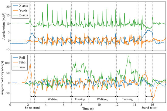 After the measurement, the data from each sensor were transferred to a laptop using dedicated software to synchronize the data between the sensors. The 10 MWT data from both trials were analyzed, excluding the first and last steps and including data from the acceleration and deceleration paths. The TUG followed the method of a previous study [13], with the sub-phases of sit-to-stand and stand-to-sit, as well as the start and end points of the two turning phases, identified. Specifically, the sit-to-stand and stand-to-sit phases were identified by the maximum and minimum values of the pitch angle of the lumbar angular velocity, respectively (see the pitch angle in the lower part of Figure 2). Additionally, the two turning phases were identified as the maximum absolute value of the yaw angle, followed by locating the range before or after this value and below a threshold value of 0.1 (see the yaw angle in the lower part of Figure 2). The first walking phase was defined as the period from the end of the sit-to-stand phase to the start of the first turn. The second walking phase was defined as the period from the end of the first turn to the start of the second turn. In this study, only these walking phases were used in both tests to analyze the data while walking in conjunction with the 10 MWT.