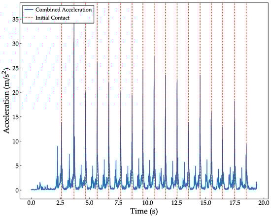 Pre-processing for use with the NN input data was performed as follows: First, the acceleration data were high-pass filtered at 1 Hz to exclude the effects of gravitational acceleration. Next, to use the data for each gait cycle, the combined accelerations of the right and left ankles, as shown in Equation (1), were calculated, respectively. These calculations were then differentiated from one sample neighbor, and the periodic peak value was defined as the initial contact (IC) for each cycle (Figure 3). For example, if the right gait cycle is 4 steps in the first walking phase of the TUG and three steps in the second phase, seven data sets for the right gait cycle were obtained. This study used left gait cycle data in the analysis because more left gait cycle datasets were obtained than right.