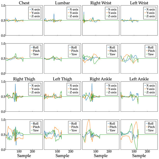In contrast, data from the lower back, which has been a focal point in prior studies [18,22], exhibited less significance in determining the level of gait independence in this study than data from the wrist and ankle. This discrepancy can be attributed to the normalization method employed in this study. Specifically, the maximum value among all eight normalization sensors consistently originated from the wrist or ankle across all subjects. Consequently, relatively minor acceleration and angular velocity fluctuations were observed in the chest and lower back, as illustrated in Figure 4. This normalization method was selected based on the premise that the interplay between acceleration and angular velocity across different anatomical sites plays a crucial role in determining walking independence. Therefore, modifying the normalization method, such as by adopting regional normalization, may yield diverse outcomes in future investigations.