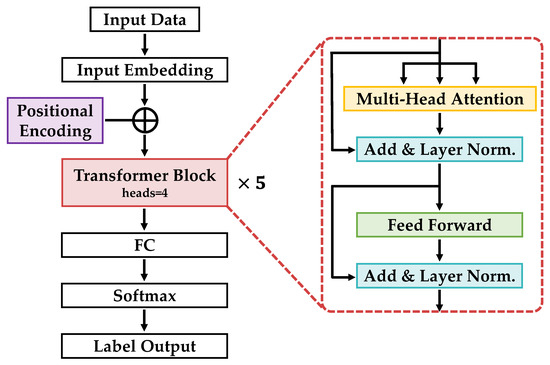 Transformer was implemented using PyTorch version 2.0.0, a Python library. The Transformer is a machine-learning model [20] known for its strong performance in natural language processing and image recognition tasks. It is built around an attention mechanism (attention) that selectively highlights important feature information by computing the association between each input element and the other elements. This enabled the model to effectively capture long-distance dependencies and flexibly learn feature combinations at different locations. The architecture of the Transformer model used in this study included an input layer, Input Embedding, Positional Encoding, Transformer Block, Fully Connected (FC) layer, Softmax Function, and an output layer. The Transformer Block comprises a multihead attention module, feed-forward module, Layer Normalization, and residual connection, which were repeated five times in this study for deeper learning. The program defined a class using nn.Module and nn.TransformerEncoder, which incorporated the embedding layer, Positional Encoding layer, Transformer’s encoder layer, and FC layer. The structure of the Transformer network is illustrated in Figure 5, and the specifics of the parameters for each network layer are listed in Table 1. The input and output sizes from the input data to the Transformer Block in Table 1 represent the batch size, data length, and number of channels, respectively. Details regarding the batch size and number of channels are described below.