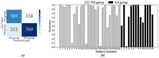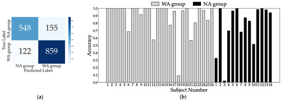 Confusion matrix (a) and individual inference results (b) of LOOCV using three sensors: right ankle, left wrist, and right wrist.
