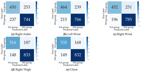Because two patients had missing TUG measurement data, we analyzed 40 patients for the 10 MWT and 38 patients for the TUG. The total number of gait cycles analyzed was 1684, with 981 in the WA and 703 in the NA groups. The dataset size was increased fivefold at each training iteration, resulting in approximately 8000 datasets. When trained with all eight sensors, the accuracy, sensitivity, and specificity were 0.836, 0.876, and 0.780, respectively. The confusion matrix and inference results for each subject are shown in Figure 6. Most subjects had an accuracy of 0.5 or better, but subjects 18 in the WA group and 1 and 3 in the NA group did not improve with further changes in the hyperparameters during learning. Next, we checked accuracy by excluding one sensor at a time to identify the critical sensor attachment sites for learning and inference. The results show that the accuracy decreased significantly for the right ankle (0.709), left wrist (0.730), right wrist (0.735), right thigh (0.801), and chest (0.812), as shown in Figure 7. Training with these five sensors yielded a slightly lower accuracy of 0.830, whereas the specificity improved to 0.821 compared to all eight sensors (Figure 8). Using three sensors (right ankle, left wrist, and right wrist) resulted in an accuracy of 0.795, which was lower than that achieved using five sensors (Figure 9). Finally, when comparing the accuracies of the two sensor combinations (right ankle/left wrist and right ankle/right wrist), the latter was superior, with an accuracy of 0.736 (Figure 10). The four LOOCV performance metrics are listed in Table 4.