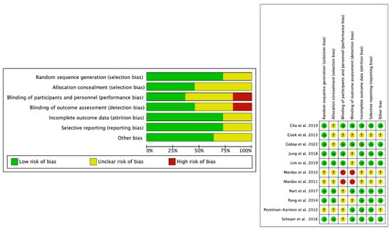 The risk of bias assessment of included studies using the Cochrane Risk of Bias Tool (RoB2) found no studies scoring positively in all domains. Random sequence generation (selection bias), incomplete outcome data (attrition bias), and selective reporting (reporting bias) were the domains with the highest compliance. Blinding of participants and staff and blinding in outcome assessment (performance and dropout biases, respectively) were unclear or noncompliant in the included studies. Nevertheless, seven studies [,,,,,] met most of the domains (Figure 3).
