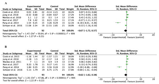 Data were analyzed using Review Manager software (RevMan Software. Version 5.4.1, The Cochrane Collaboration, Copenhagen, Denmark; 2020). Due to the heterogeneity of the results, a random-effects meta-analysis was performed for studies that assessed BCW and for those that assessed BCH. CBV was reported by only one study. All were based on mean difference (MD) and standard deviation (SD) for estimating continuous data and for assessing categorical data, with 95% confidence intervals (CI). Heterogeneity was considered low with I2 = 0–30%; moderate, with I2 = 40–50%; substantial with I2 = 60–75% and high with I2 ≥ 75%. The threshold for statistical significance was set at p < 0.05. No meta-analysis of adverse effects was performed due to the scarcity of reports on the subject.