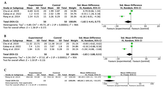 Meta-analyses were performed for pooled studies evaluating BCH and BCW (Figure 4A,B, respectively) and for those comparing bone mineral graft and collagen membranes with spontaneous healing of the postextraction alveolus (Figure 5C,D, respectively). Only the study by Pang et al. [] compared BCW between sockets filled with bone substitutes and collagen membranes, and those that healed by spontaneous healing (Figure 5E). Heterogeneity was high in all studies (I2 > 75%). All studies analyzed bone mineral grafting together with collagen membranes and compared it with spontaneous healing of the alveolus. The study by Stumbras et al. [] was not included in the meta-analysis due to a lack of data supply. The results of the meta-analyses showed a trend toward dimensional change in the bone crest in both height and width, with bone mineral grafts and collagen membranes, although without statistical significance. p = 0.21 and p = 0.22 for the BCH and BCW evaluations, respectively, in the pooled study analysis; p = 0.17 and p = 0.13 for BCH and BCW assessments, respectively, in the analysis of studies comparing bone mineral grafting and collagen membranes with spontaneous alveolar healing. Only one study assessed BCW, and, despite finding a trend toward statistical significance, it was not measurable in the meta-analysis. The studies with the greatest statistical weight were those of Cha et al. and Gabay et al. [,]. The Forest Plot diagrams are shown in Figure 4 and Figure 5.
