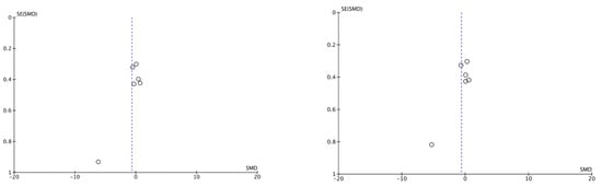 The abscissa axis (X) represents the magnitude of the effect, and the ordinate axis (Y) represents the risk effect. The middle line represents the central estimator. The symmetry of most studies demonstrates a low publication bias, although the paucity of studies limits this consideration (Figure 6).