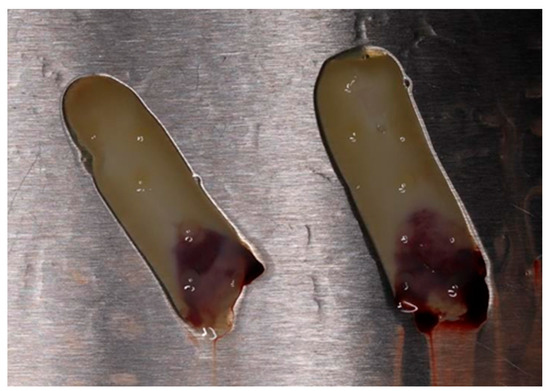 Venous blood was collected from each patient from the study group using sterile vacuum tubes (Matrix Choukroun) without additive. Immediately (in maximum 90 s), the tubes with whole blood (10 mL in each) were centrifuged by Duo Quattro (Choukroun PRFTM System) at 1300 rpm for 14 min. After centrifugation, A-PRF gel represented as the buffy coat in the middle layer was carefully isolated from the red blood cell clots. Half of the prepared A-PRF was pressurized to remove the liquid components to make A-PRF membrane for later use (Figure 1). The rest of the prepared A-PRF was used as such.