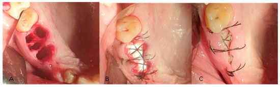 (A) Post-extractional alveoli. (B) Alveoli cu APRF and flattened collagen sponge and suture. (C) Surgical sites 7 days after the intervention.