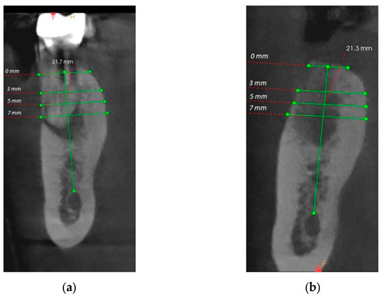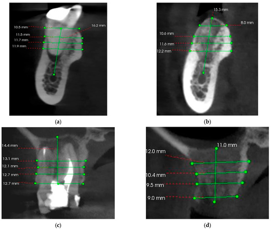 CBCTs were performed using Carestream CS 8100 3D (Carestream Dental LLC, Atlanta, GA, USA), and interpretation was performed using Carestream 3D Imaging Software, 3D Suite 3.10.38 by the same operator. To evaluate the bone level lost after the extraction, initial and final measurements were both performed in the buccal–lingual plane. In order to have some clear measurements, the maxillary sinus and the mandibular canal were established as fixed reference points. The radiopaque lines of the buccal and lingual corticals were considered the alveolar walls.