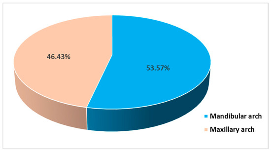 All participants completed the surgical protocols. The causes of the extractions were mainly fatigue tooth fractures (45.72%), severe caries (28.58%), failed endodontic treatments (21.42%), and chronic periapical periodontitis (4.28%) (Figure 5). The extractions were performed in the molar areas: 32 (45.72%) in the maxilla and 38 (54.28%) in the mandible (Figure 6). There were more mandibular teeth in the A-PRF group, and more maxillary teeth in the control group, but the differences were not statistically significant (χ2(1) = 1.497, p = 0.274). The details are presented in Table 2.