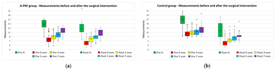 Measurements before (“Pre” values) and after (“Post” values) the surgical intervention for (a) A-PRF group and (b) control group.