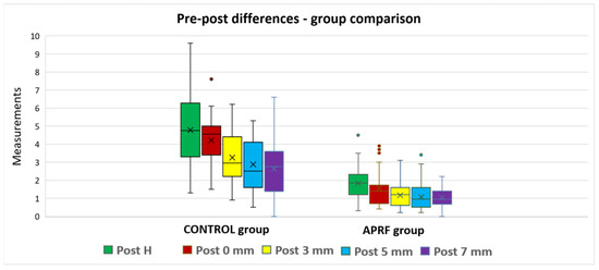 For A-PRF group, the differences were normally distributed only for heights; therefore, the variation of this parameter was analyzed based on a paired samples t-test, to determine whether there were statistically significant mean differences between the values measured before and after ARP. One outlier was detected that was less than 1.5 box-lengths from the edge of the box in a boxplot. Inspection of this value did not reveal it to be extreme and it was kept in the subsequent analysis. The normal distribution was assessed by the Shapiro–Wilk test (p = 0.275). For heights, the values measured after ARP expressed a statistically significant decrease compared to the values measured before ARP (t(41) = 12.62, p < 0.0005). For all four widths, the pre–post differences were not normally distributed, so the variation of this parameter was analyzed based on a Wilcoxon signed-rank test. There was a statistically significant median decrease for all width measurements: 0 mm (decrease from 7.45 to 5.90, z = −5.649, p < 0.0005), 3 mm (decrease from 9.00 to 8.10, z = −5.652, p < 0.0005), 5 mm (decrease from 9.80 to 8.90, z = −5.652, p < 0.0005), and 7 mm (decrease from 12.20 to 10.70, z = −5.585, p < 0.0005).