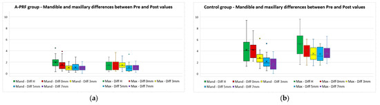 Maxillary and mandible differences between “Pre” and “Post” values for (a) A-PRF group and (b) control group.