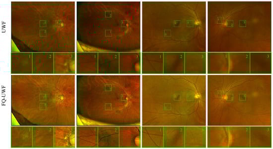 Figure 2 presents sample results of the proposed method. As image quality can be subjective, we compare manual annotations of drusen from fundus images and UWF images after applying our enhancement method. Experimental evaluation demonstrates that the similarity between annotations after enhancement is considerably improved compared to annotations made on images before enhancement. Quantitative measurements of image quality are also assessed, demonstrating state-of-the-art results on several datasets. Based on our goal and the experimental findings, we refer to the enhanced images as fundus quality (FQ)-UWF images. We believe that our approach has the potential to improve the accuracy of clinical assessments and treatments, ultimately leading to better patient outcomes.