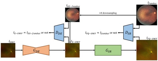 Figure 3 presents a visual overview of the framework. The order of the processes is tailored to maximize the quality of the output FQ-UWF images. The generator networks of each process, which we respectively denote as