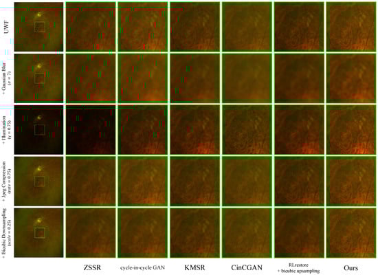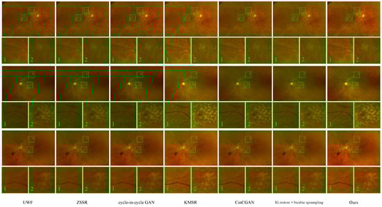 , even when employing the bicubic upsampling method, outperformed the results using only the SRM network. This suggests that super-resolution without adequate degradation removal has limitations in enhancing retinal images.