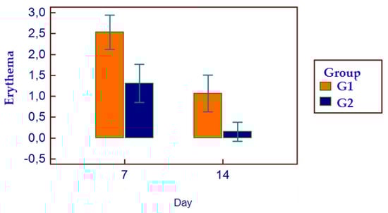| erythema | 1.70 ± (1.08) | 0.73 ± (0.82) |