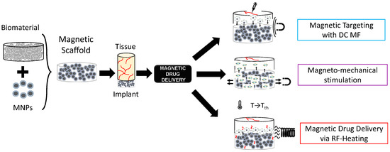 Magnetic nanoparticles (MNPs) are particles (<200 nm in size) composed of magnetic elements, such as iron (Fe), nickel (Ni), cobalt (Co), or their oxides (e.g., magnetite, maghemite, etc.) [34]. Zn- and Mn-substituted magnetite MNPs hold therapeutic potential against colorectal cancers [35,36]. If MNPs are embedded in biomaterials such as bio-ceramics or biopolymers, thus creating a so-called magnetic scaffold (MagS), theragnostic and multifunctional abilities are provided to scaffolds, creating new usage and applications. By varying the magnetic field strength in space or time, it is possible to control the physical, structural, and mechanical properties of these magneto-responsive scaffolds. Therefore, MagSs can be used for TE, DD, or CT [37]. MagSs can be activated (i) by static or very low-frequency MF-triggering mechanical forces and deformations, or (ii) by alternate MFs for magnetothermal conversion.