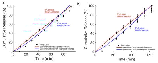 The data from the magnetic microsprouter from [41] (taken from Figure 4 pag. 4; Figure 6 pag. 6 from [41]), are presented in Figure 2. The figures of merit to evaluate the fitting quality and select the most suited kinetic model are provided in Table 2. The fitting results are presented in Figure 2. The best fitting model is the KPM model. In [41], methylene blue (MB) and DTX were considered as the drugs to be released. The cumulative release is studied in the case of a non-magnetic scenario and for a static MF applied to the MagSs. For the MB, few differences (~10%) are found between the two cases (17.81 μg vs. 19.97 μg) [41]. It must be reported that the authors tested different MF strengths, and a non-linear quadratic () trend of the maximum-released drug concentration as a function of the strength of the magnetic flux density vector (, in mT) can be derived from the data from [41]. The authors did not report the exact values of and ; therefore, it is not possible to directly relate the DD data to the material properties. However, the magnetic force exerted on the MagSs by the action of the external field is [65,66]; thus, by increasing the field strength, the gradient increases and so the force increases too. Therefore, if the DD mechanism is dictated by the mechanical deformation, a higher can ensure a faster and more sustained release. However, the drug molecule can affect the release kinetics and the MagS features can impact on its release too. The most relevant case is DTX release. From the fitting coefficients reported in Table 3, and the actual docetaxel release [41] (data from pag. 6, Figure 6 from [41]), whose profiles are presented in Figure 2b, it can be noticed that the magnetically triggered and controlled release results in a larger proportionality constant (~twofold) and in a super transport condition () [59,60,61]. From these quantitative findings, the boost of the release resulting from the MF action mediated by the magnetic biomaterial is evident.