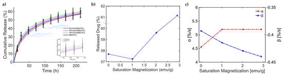 With this knowledge, the release from the MBG-PCL 3D-printed scaffolds loaded with Fe3O4 MNPs under dynamic MF exposure could be better interpreted [46]. Indeed, the magneto-thermal conversion triggers a high DOX release useful for CT applications. In [46], (see Figure 5, pag. 7950 from [46]), the experimentally measured curves of drug release over time present a general sigmoidal trend, as shown in Figure 5. In [46], different MagS compositions have been tested, so information about how and relate to kinetic parameters can be modeled for the first time. In Figure 5a, the data and the results from the fitting are shown. The best model fitting the release data for the bare MBG/PCL and the magnetic MBG/PCL scaffolds is the Gompertz model, as can be inferred from Table 7. By observing the retrieved coefficients for the Gompertz model (Table 8), a pattern can be identified. It can be noticed that a nonlinear relationship between the percentage of released drug at the final time (h) and can be identified (Figure 5b). It must be reported that the increase in the volumetric content of MNPs in the biomaterials leads to a slight modification of and increase in MagS porosity [41,42,43,44,45,46,47,48,49,50,51,52,53]. However, despite the porosity changes, we hypothesize that the differences in the DD mechanism are mediated by the interactions between the MF and the MagS. In other words, we assume that the released value is therefore a function of MagS features, considering that the MF parameters were fixed [49]. Therefore, and parameters, representing, respectively, the undissolved proportion and the dissolution rate, must be linked to MagS saturation magnetization. As it can be observed in Figure 5c, the parameter is characterized by an approximately constant trend for all MagS compositions, hence being independent from the fraction of MNPs contained in the biomaterial (). On the other hand, observing in Figure 5c, it is possible to infer that the dissolution rate depends on in a linear way ().