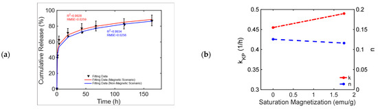 This chemically doped MagS releases gentamicin under the action of 1.47 kA/m, 232 kHz MF [50]. The release curves from Figure 11, pag. 1287 ref. [50] are reported in Figure 6a. It is possible to observe that the MagS can release ~10% more drugs after 40–60 h than its nonmagnetic counterpart. From Table 9, it can be seen that both the modified Gompertz model (Equation (1)) and the KPM are suited to model kinetics. The release constant for the two cases has a 6% difference, and the transport process is diffusion-dominated (), leading to similar undissolved proportions across the two cases, whilst a 13% difference in the value of the dissolution rate coefficient is obtained, as shown in Figure 6b.
