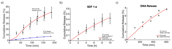 Finally, we focused on the investigation of a relevant case in which MagSs allowed drug transport by an external MF for triggering and controlling the release of very different drugs and biomolecules. In [49], nanoporous ferrogels were loaded with agents of three very different molecular weights and of diverse types [51] (see Figure 3, pag. 69 in [51]). Thus, the controlled release, mediated by the MF, has been evaluated, even under different drug functions or bioactive agent loadings. As first, the release of mitoxantrone for therapeutic purposes was performed in the presence and absence of MFs (Figure 7a). It can be noticed that, in the magnetic scenario, an increased release of ~40% is observed. The Gompertz model is the best fit (see Table 10). A faster release kinetic and dissolution rate (~3 time) are observed, as well as a modification of the release mechanism (i.e., from non-Fickian to super transport) for the two cases can be noticed (see Table 11). Then, the releases of plasmid DNA condensed with polyethylene diamine (with a molecular weight of ~106) and chemokine SDF-1α (with a molecular weight of ~8000) [51] from the MagS were modeled. It must be noticed that, in this case, the stimulation has been changed from 2 h intervals to 30 min, with magnetic stimulation achieved through 120 on/off cycles lasting 2 min, so that the highly macroporous structure was reversibly deformed, with subsequent release [51]. According to Figure 7b,c and the results from Table 10, the Gompertz equation faithfully simulates the envelope of the release kinetics of the loaded drug and of the other agents, with a high molecular weight. It is worth noting that the release of the chemokine is not sufficient and relatively low values are reached (Figure 7b). However, by relying on the findings shown in Figure 7c, considering the perspective of using MagSs as platforms for TE and CT, an ~8% release of plasmid DNA, in several hundreds of minutes, can be achieved from the MagSs using the external MF. The limited DNA release falls under a non-Fick mechanism that deserves further study, but could be optimized by relying on MagS properties and external MF parameters.