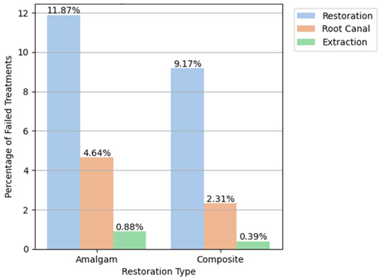Examining the follow-up treatments indicative of amalgam restoration failure revealed that the portion of a repeat restoration was the largest, with 13,442 repeated restorations (11.87% failure), 5252 root canals (4.64%), and 998 extractions (0.88%). The follow-up treatments indicative of composite restoration failures showed that 50,935 (9.17% failure) underwent repeated restoration, 12,821 required root canal treatment (2.31%), and 2187 (0.39%) required extraction (Table 3, Figure 1).