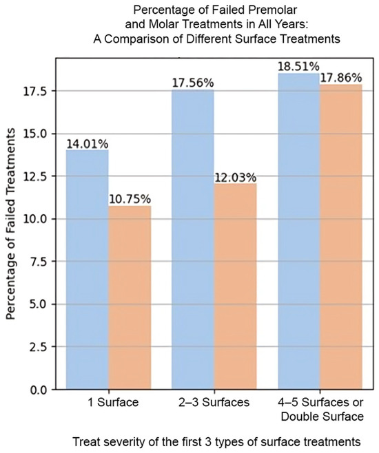 Treatments were conducted after the first filling was taken from the additional treatments, such as tooth extractions, root canal treatment, composite resin, or amalgam restorations. The period for defining a failure was four years after the restoration. The first restorations were performed in 2014–2018. There were data only until the end of 2021. That mean then, for procedures in 2018, no failures have been recorded yet. An interval of 4 × 365 days was taken.
