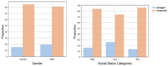 There was significantly less amalgam than composite restorations in males compared to females (p < 0.0001), as well as in individuals of all socio-economic statuses (p < 0.0001) (Figure 3).